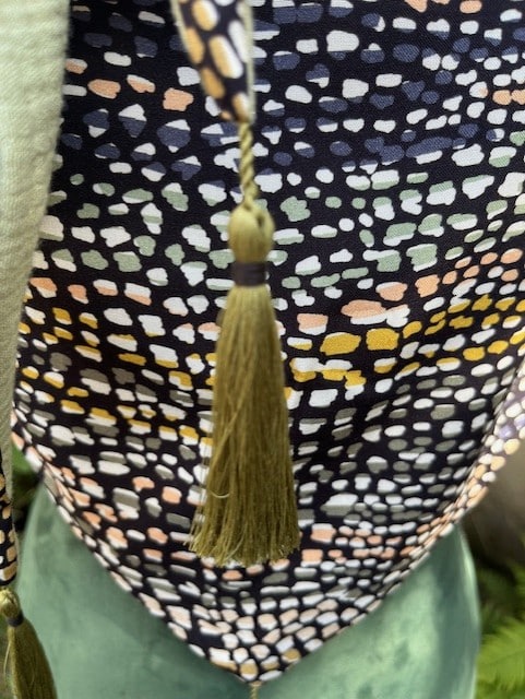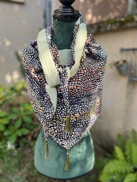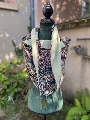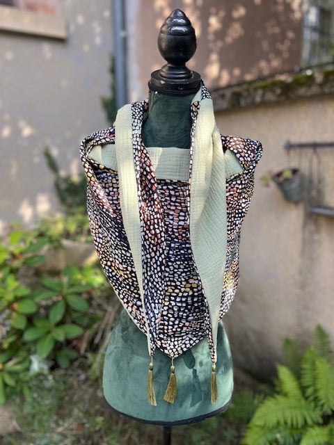 confectionné de deux tissus :un coton à motifs multicolore dur fond noire et une double gaze coton vert d’eau