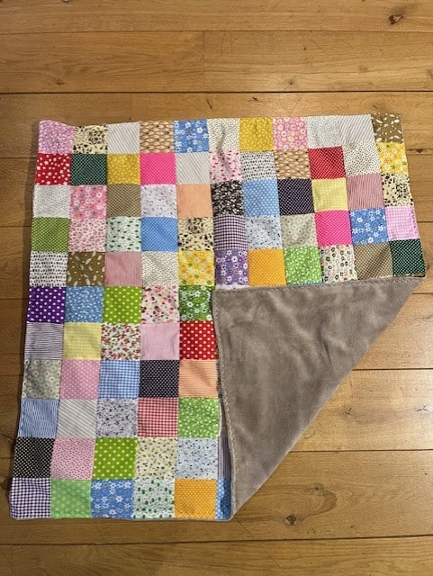 Cette couverture cousue avec amour apporte de la variété à l’œil de bébé par la diversité des tissus et leurs couleurs, développera son sens du toucher et sa motricité libre.