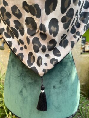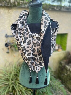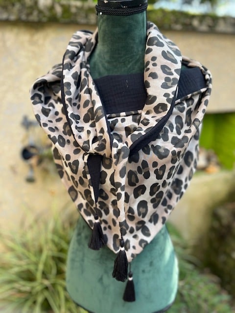 confectionné avec deux tissus : un voile de coton aux motifs panthère et une double gaze coton noire