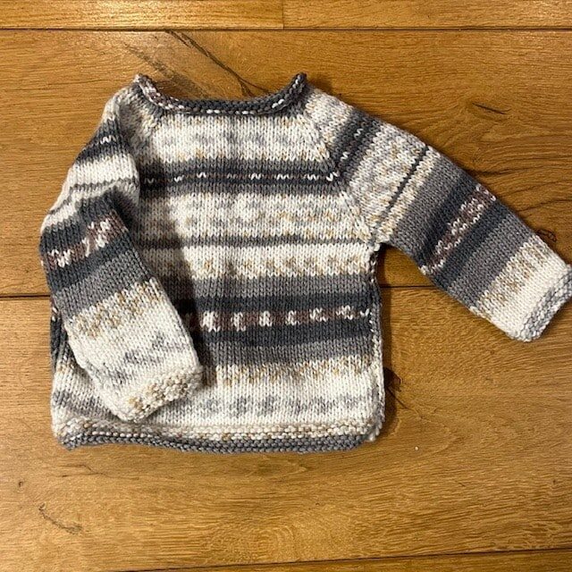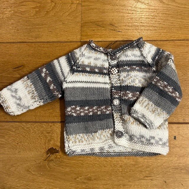 Layette, brassière premier âge , tricoté main au point mousse et jersey rayé gris blanc