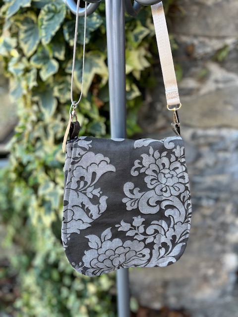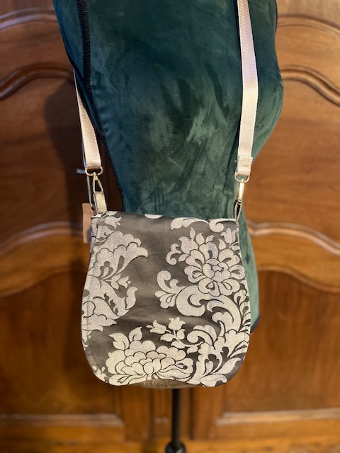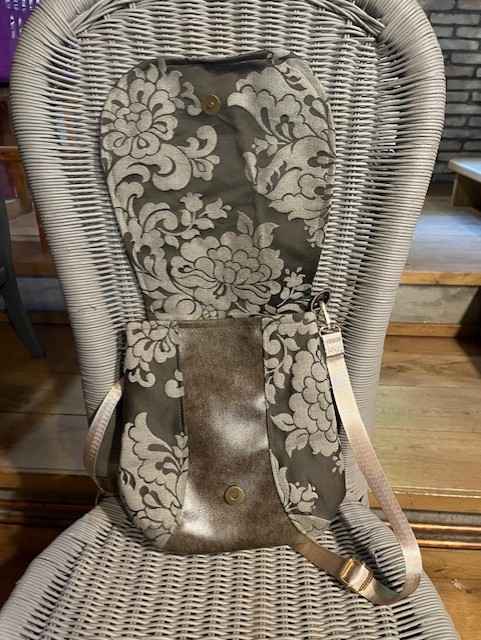 Sac bandoulière avec rabat en tissu d’ameublement à motifs grande fleur et un simili kaki marron